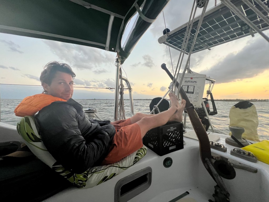 It’s my first time going this way, so it is interesting to do it at least once I guess. I was excited to see a flock of while pelicans (not to be confused with the much more common brown pelicans here), and several pods of dolphin along the way. We also were able to roll the jib out and get a little sailing in. One night we anchored out nearby the Kennedy Space Center and we were able to catch SpaceX’s Falcon 9 rocket blasting off! The sound they make is a deep bone shaking rumble that lingers in a delayed haunting manner.