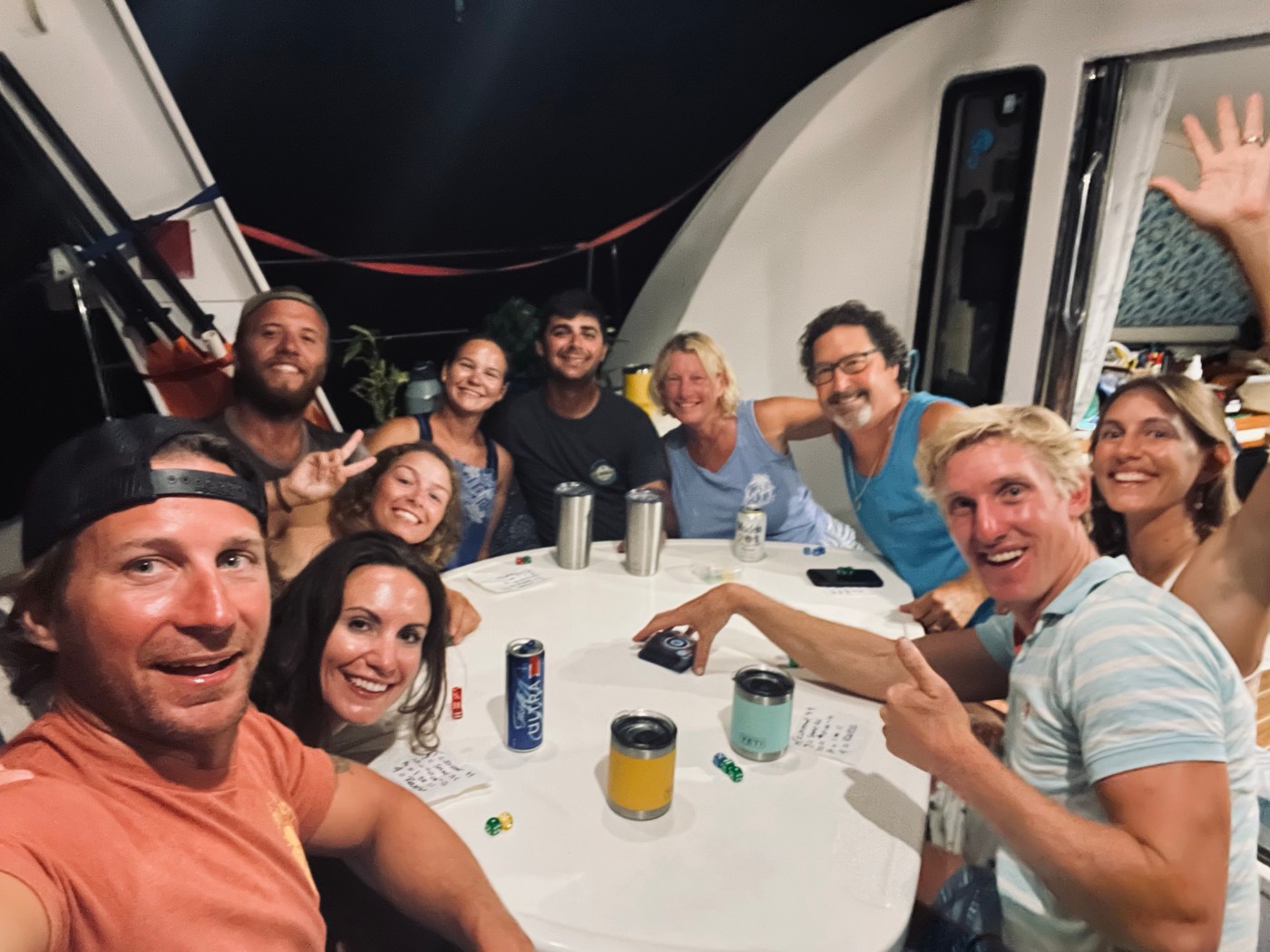 We chat with new acquaintances and laugh telling stories with now dear friends. Everyone brought a side dish, and like many sailing potlucks, the dishes had as much creativity and personality you could imagine. Potlucks with salty travelers in fairly remote islands where food’s expensive, if even available? Challenge accepted. I whipped up a cheesy Italian inspired dip with a sleeve of prized ritz crackers, Cindy and Ron made yummy dip too, S/V Allure brought two jugs of their homemade kombucha tea, and Jackie and Evan brought over the freshly prepared conch that they spent hours preparing. It was marvelous. We had a wonderful time celebrating, appreciating, and enjoying this special meal with our makeshift boat family. Afterwards, Cindy and Ron taught us a fun dice game (that I cannot recall the name of right now haha).