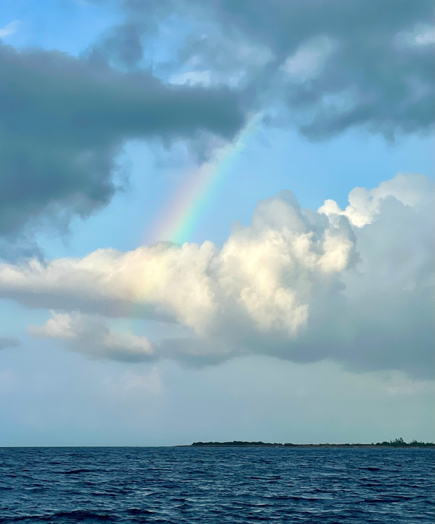 Afterwards, a rainbow shined down, and we soon dropped the hook on the west side of the island in Man O’ War Bay, Great Inagua, Bahamas. We watch the rainbow’s colors gleam while we tie things up from the passage.