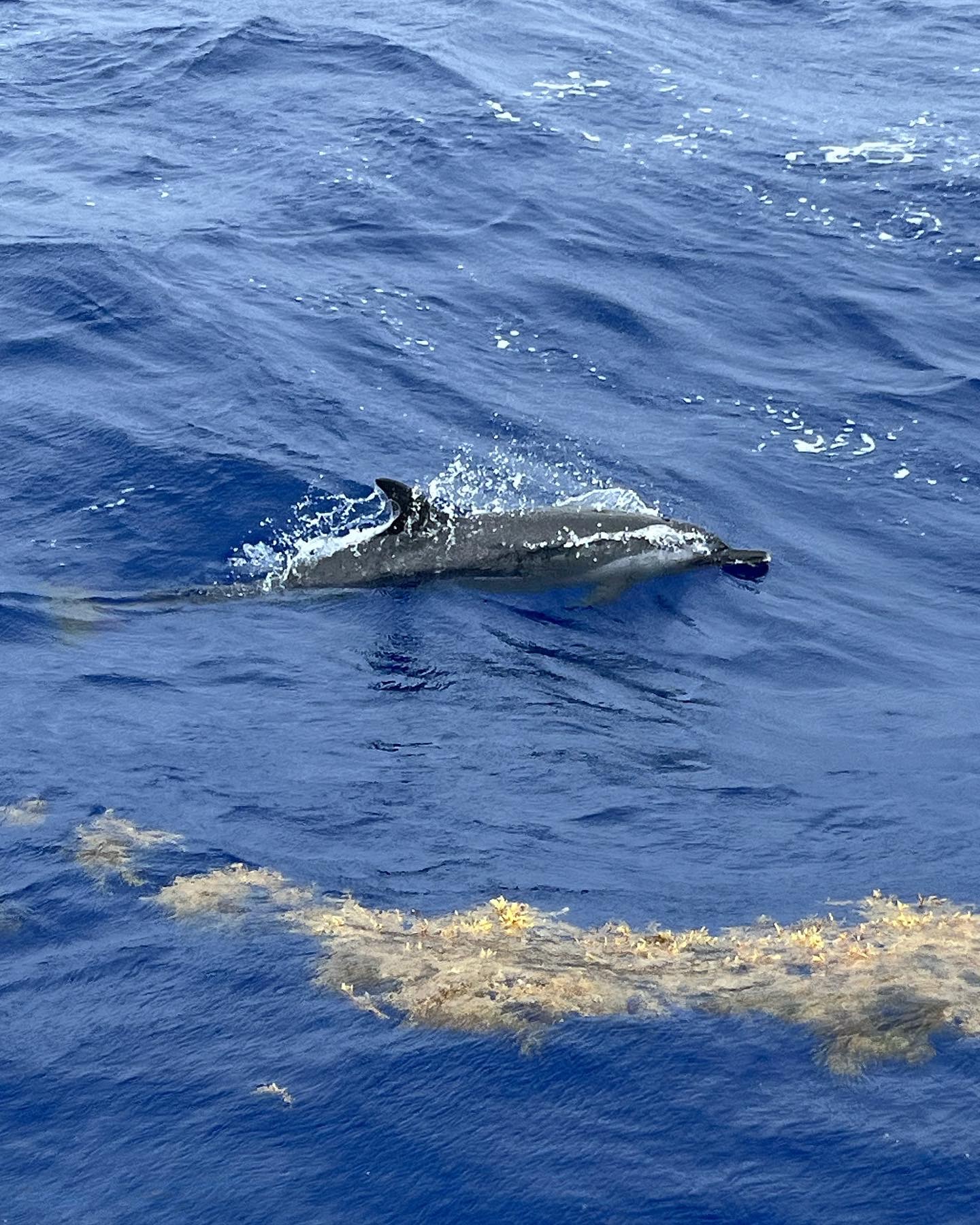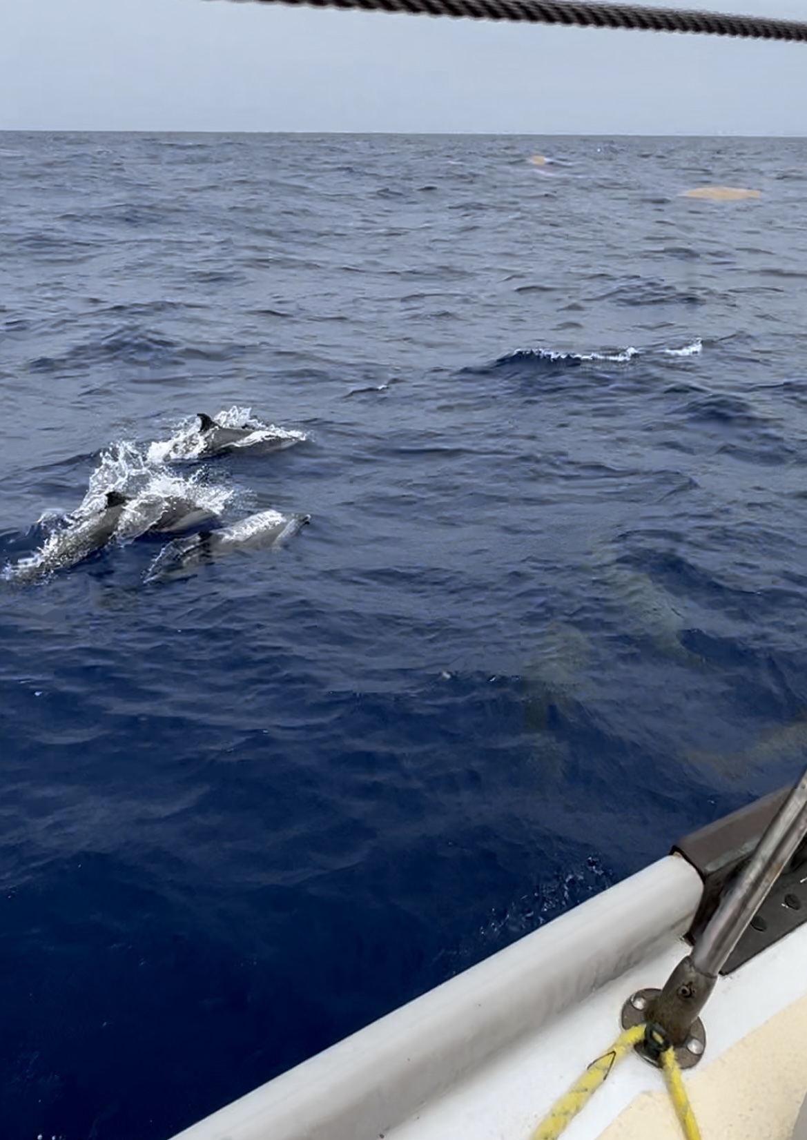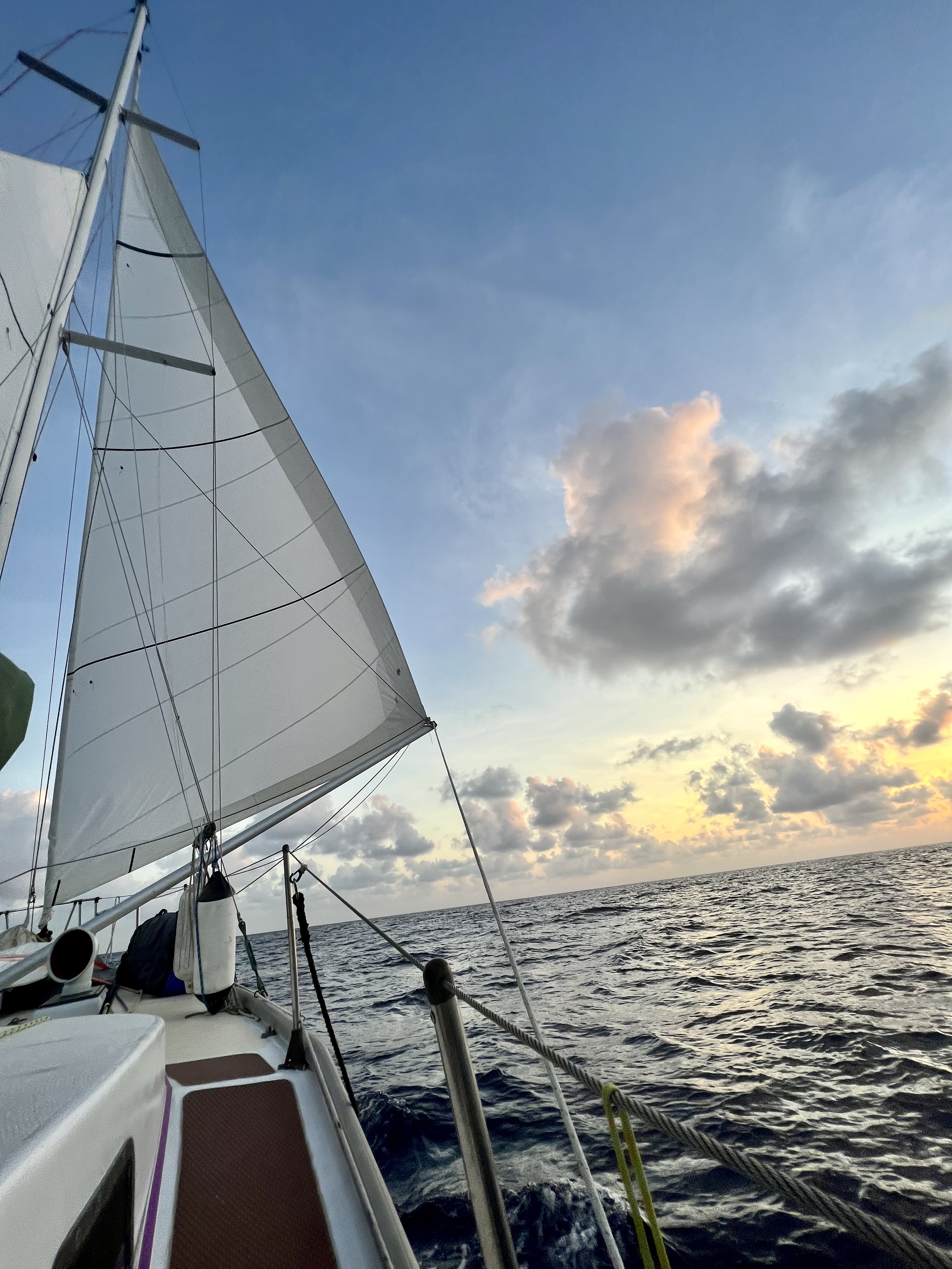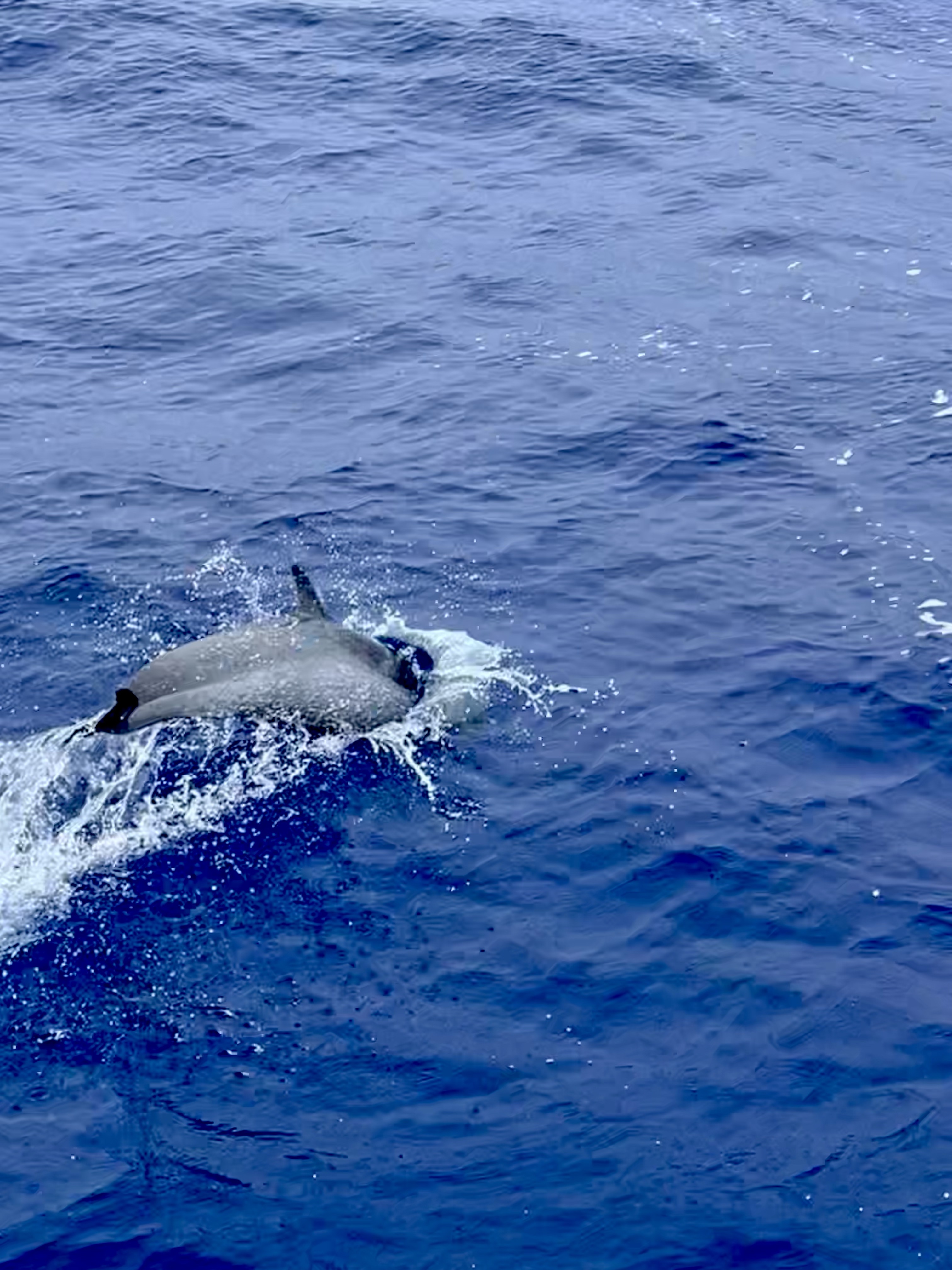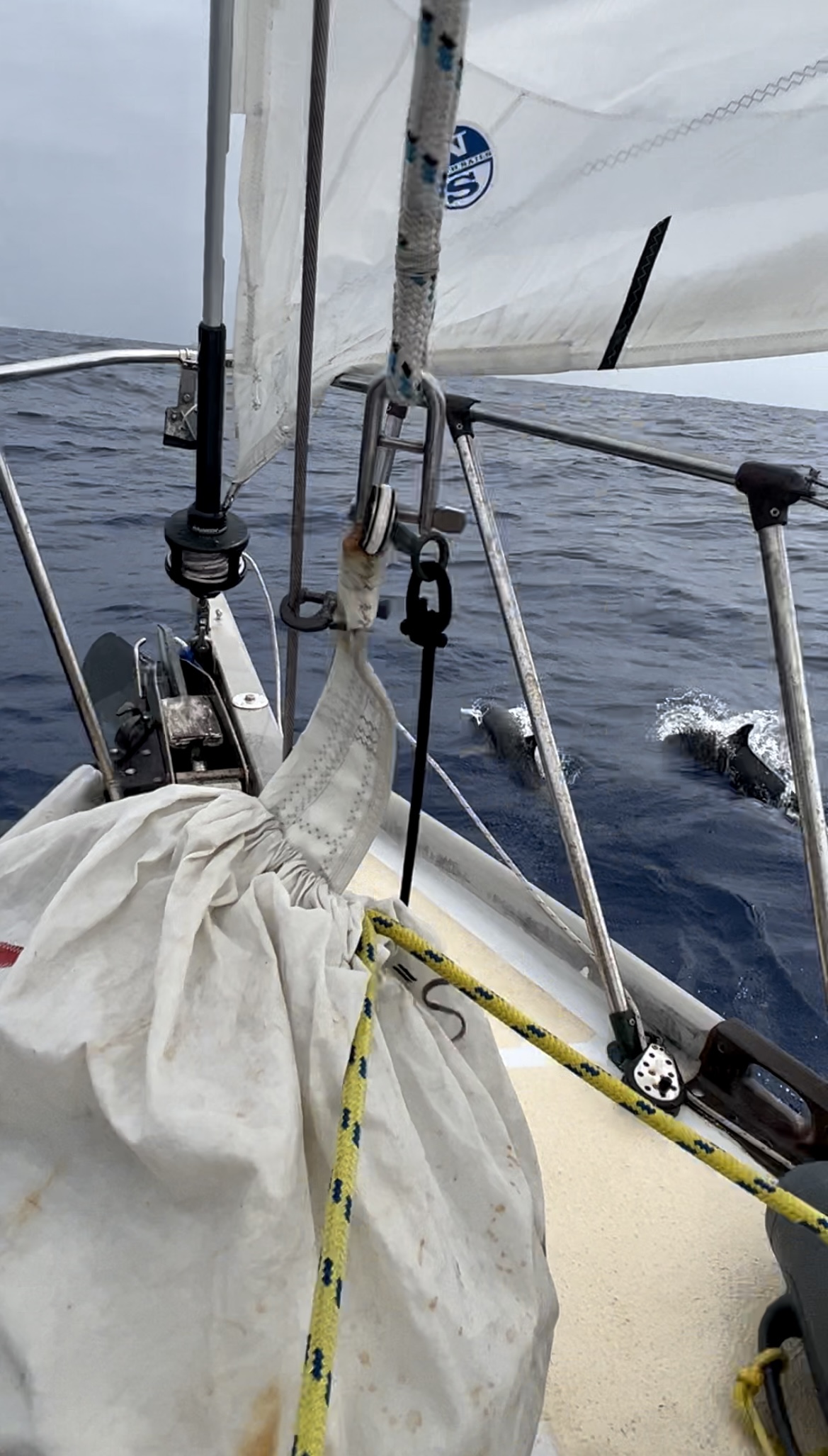 I stand up and scan along our wake. A pod of what looks to be spinner dolphins (Stenella longiristris) break through the surface and splash through the waves riding alongside Belafonte! One by one they pop up for air and race up to our bow cutting through the deep-blue water. There’s a baby! Two babies! Large adults pump their powerful tails to swim away from the boat and then zoom up to the front like a missile. They jump and play, surfing our wake and zipping through the water. I count at least 10 adults. “Brendan, dolphins!” I shout below. I watch them, mesmerized by their power, speed, and beauty. When Brendan comes up, I clip my PFD to the lifeline and slowly crawl my way towards the bow to have a closer look. I record their dance and take a few last photos before I put down my phone to enjoy this slice of nature for myself. I’m washed over by an emotion of what I can best describe as, peaceful relief coated in wondrous awe.