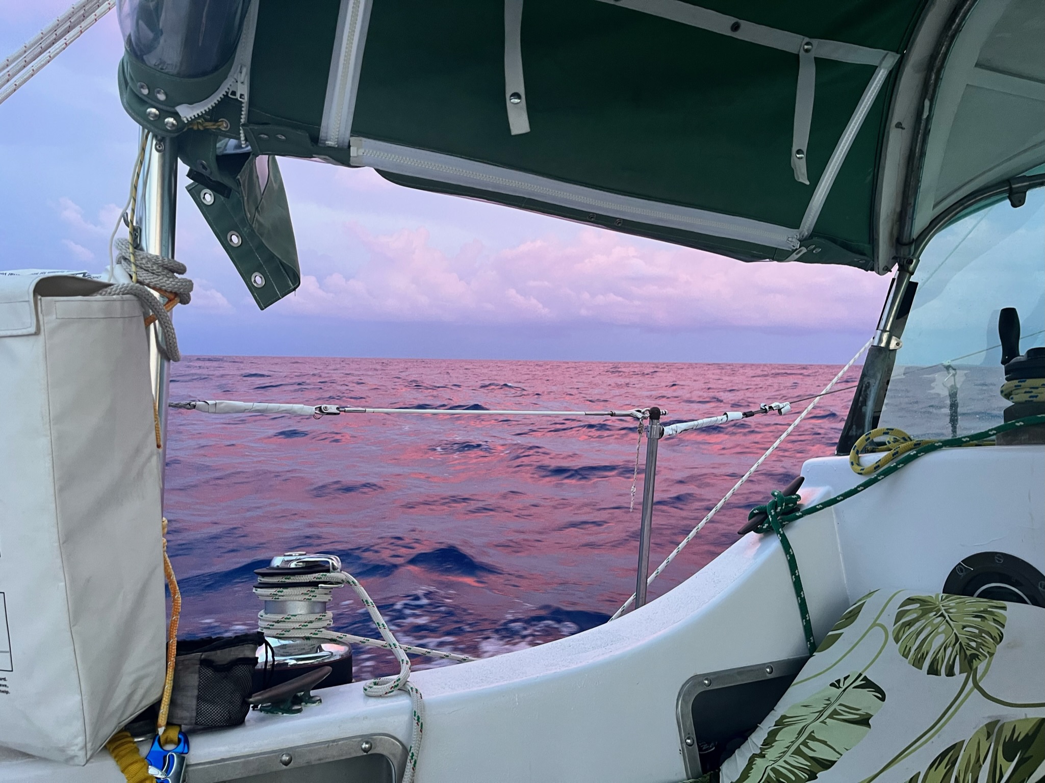 I switch between reading and practicing Spanish with preloaded lessons on the Babbel app. I listen to music on my Bluetooth speaker and jot down random thoughts and ideas that come to mind in a journal. I’ve given up brushing my hair. It’s in the worst knot it’s ever been in, and I just can’t deal with it. To keep it from dreading itself and further, I keep it in a wrecked ponytail or a messy high bun. A cloth hairband keeps the flyaway hairs away from my face and I do my best to keep up a basic personal hygiene routine. Sometimes it gets tough though. With the boat tilting, it can be a struggle just getting from one side of the boat to the other and having our head (aka restroom) at the forward bow, going potty can be an annoying zero-gravity experience.