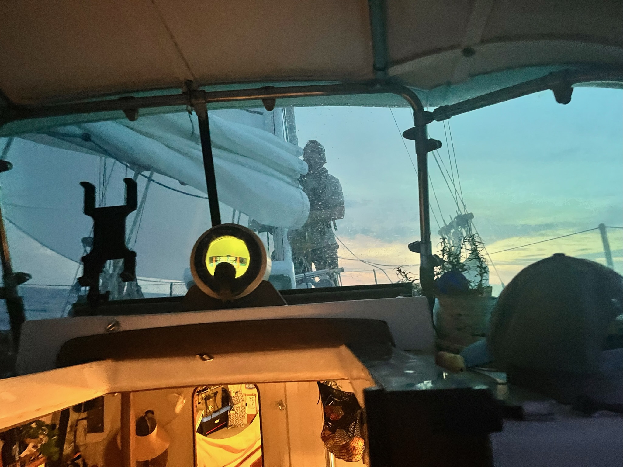 I roll off the bed and walk on deck to meet him. “How’s it going?” I ask. “Good!” He replies. Ok, he seems chipper. I need to chipper up too. I go back below to poor a cup of coffee and pretend it’s just another normal day. I start my own checks inside.