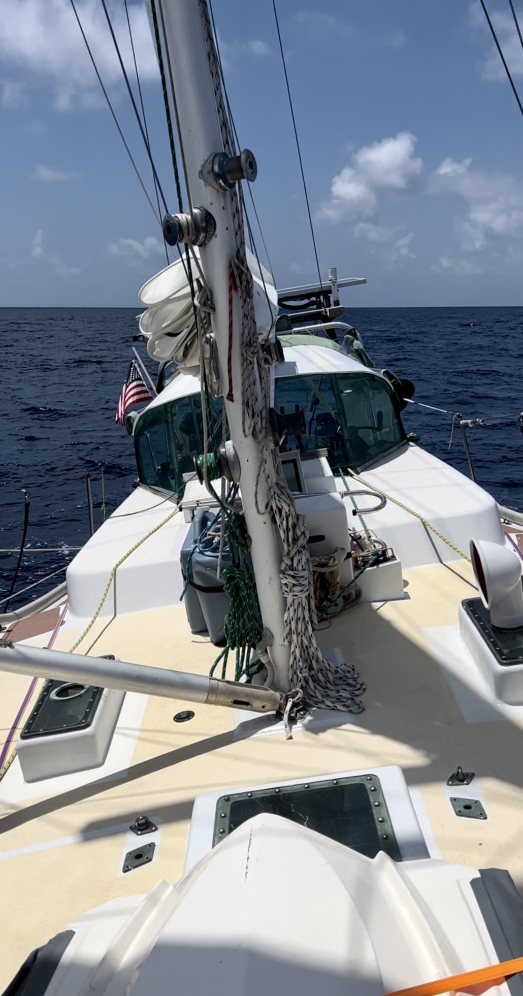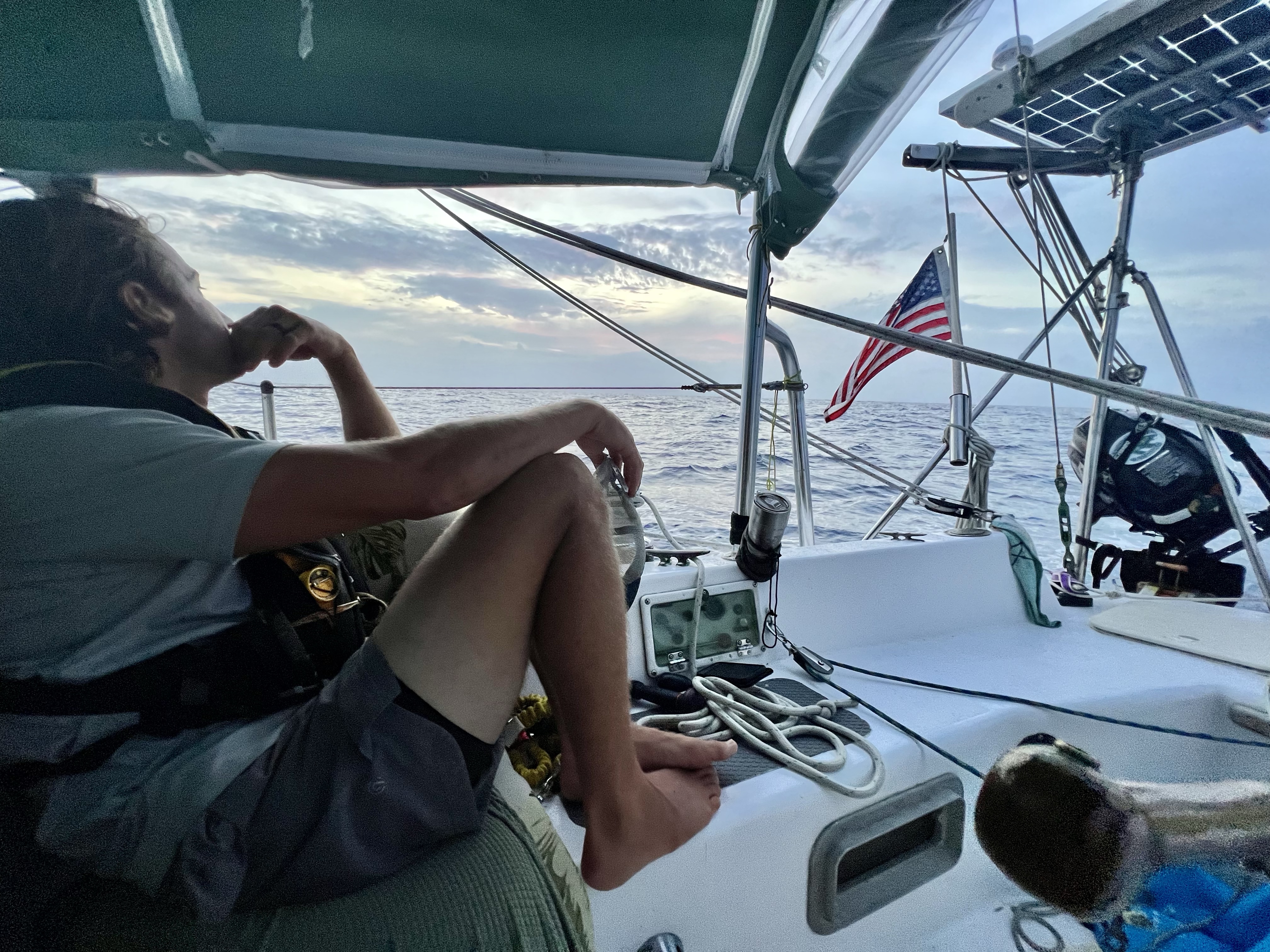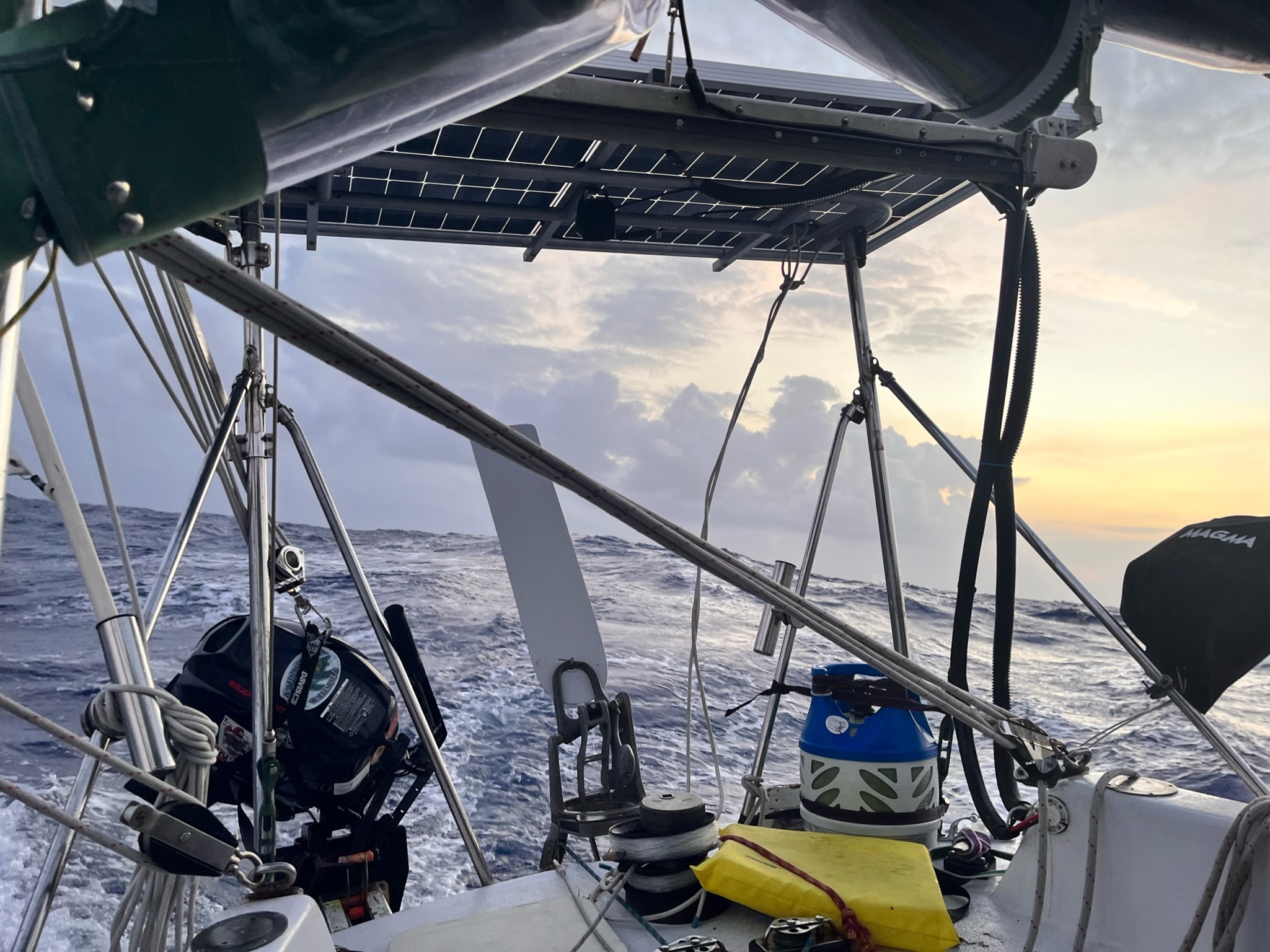 It was already day five. Days and nights rotate through our six-hour shifts. We wade through moments of gratitude and motivation, as well as grief, and discomfort. Regular radio checks with our buddy boat Motherload Sailing help keep all our minds in check. They have been experiencing their own silver linings and scares. They were fortunate enough to catch a beautiful yellowfin tuna to feed their family. Unfortunately, that luck dwindled one day when they nearly lost their rudder. This, it one of the absolute worst things that could possibly happen. It’s probably the top reason sailboats are abandoned at sea. With nearly 10,000 feet of water below us, it would have completely totaled their vessel, and this story would have been a rescue mission to save their crew. However, with a bit of luck still in their tanks, they managed to notice the issue before too long and fix it before all was lost. It’s a wild story all on its own, so I encourage you to check out their YouTube video on the event here.