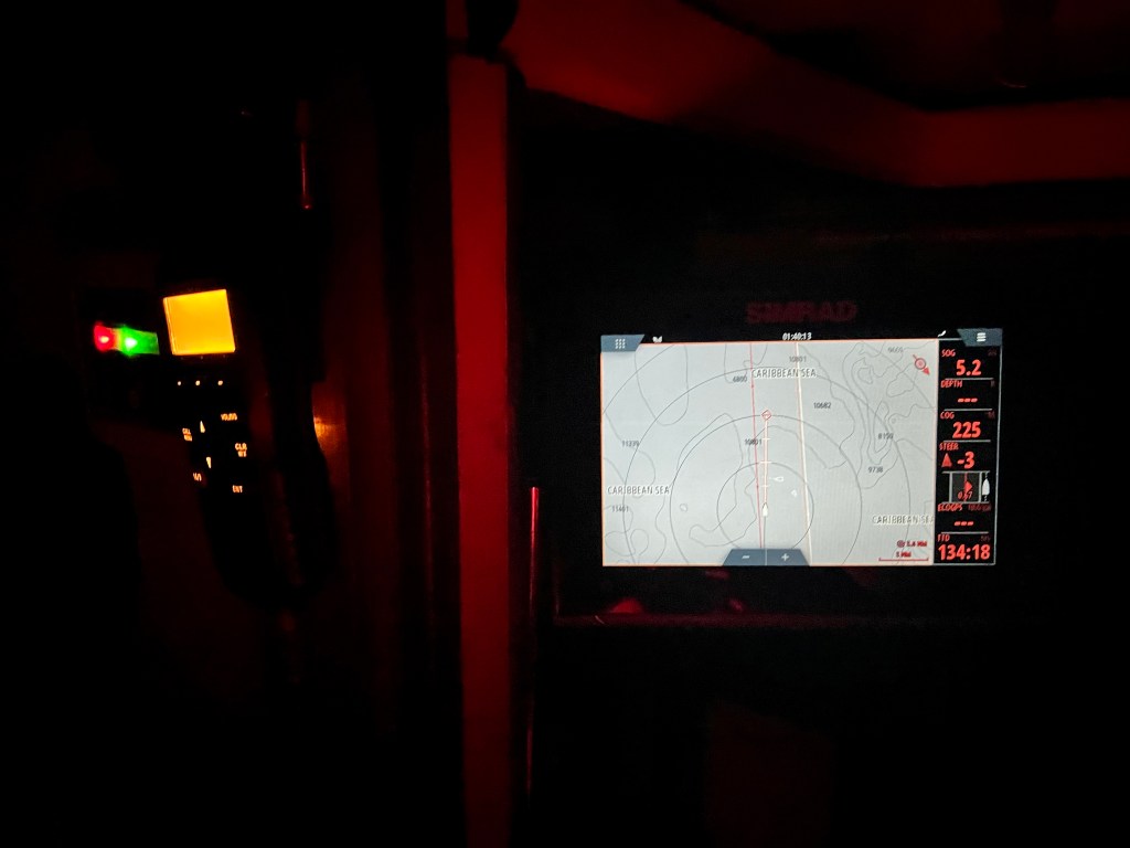 Night vision friendly red lights dimly glow my path. But even without their warm light, our proprioception on Belafonte has grown, so even in the dark we step with confident coordination through the boat. Sometimes it’s like a dance. You feel the patterns of the swell lifting and dropping you, and a rhythm from the waves leaning your world becomes apparent. Without thinking about it, you time your movements to this rhythm. Grab here during the drops, stop there for the lifts, have both feet planted for this, make your jumps during that.