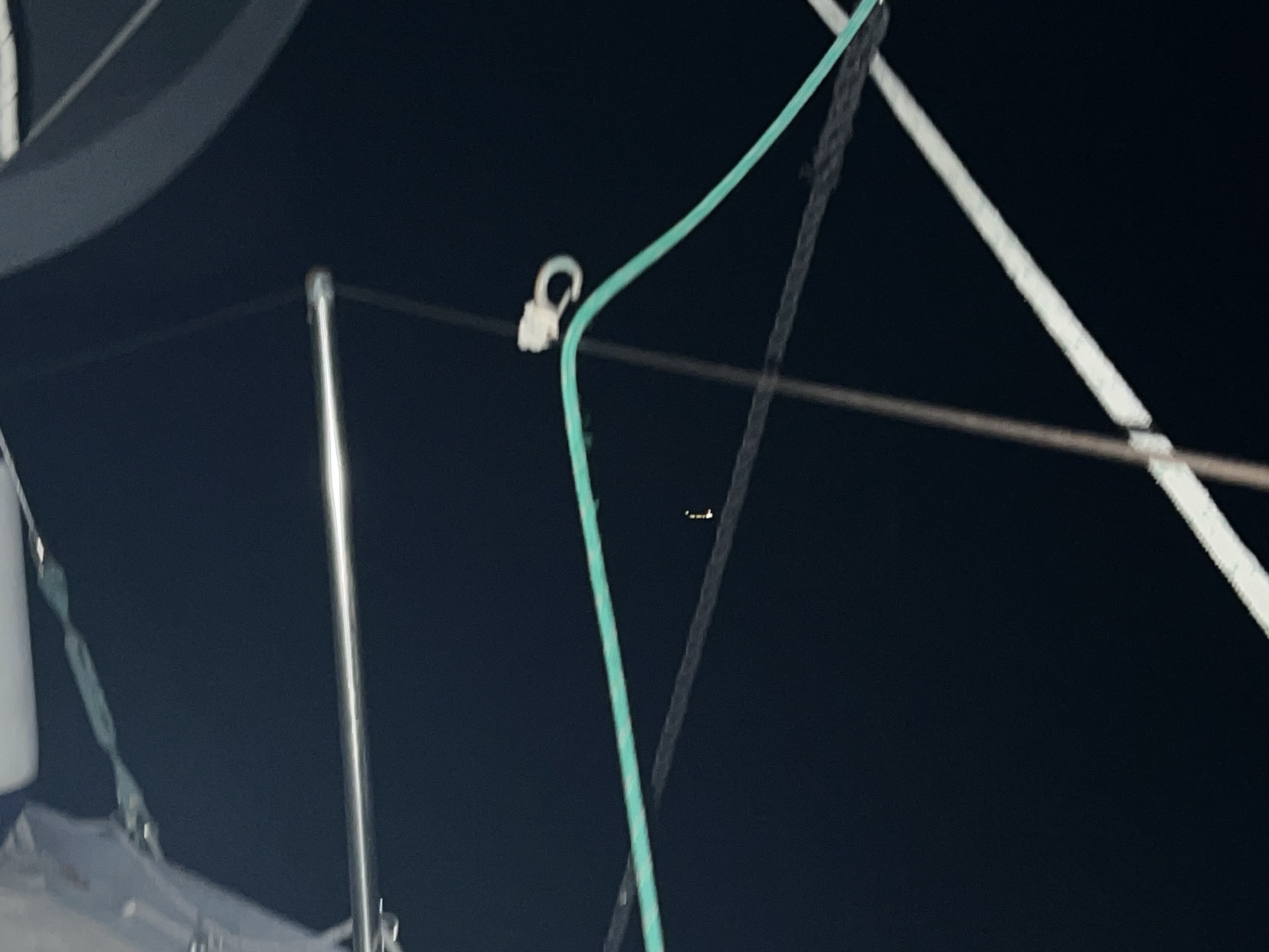 We decide to put a reef in the main sail in case the winds pick up in the middle of the night. This essentially shortens the sail area and can prevent us from being overpowered if gusts pick up. It’s much easier as a two-person job. Brendan clips his PDF into the lifeline and walks to the mast. I steer into the wind to reduce tension on the sail, being sure not to over-correct. The waves bash into our port side as Brendan makes the adjustments. “Hold on!” I nervously shout as I spot a glimmer of a larger wave approaching. Belafonte rocks dramatically for a minute then settles again. A few minutes later Brendan shouts back, “Ok, you can head back down!” I pull the tiller towards me as we turn to starboard and get back on course.