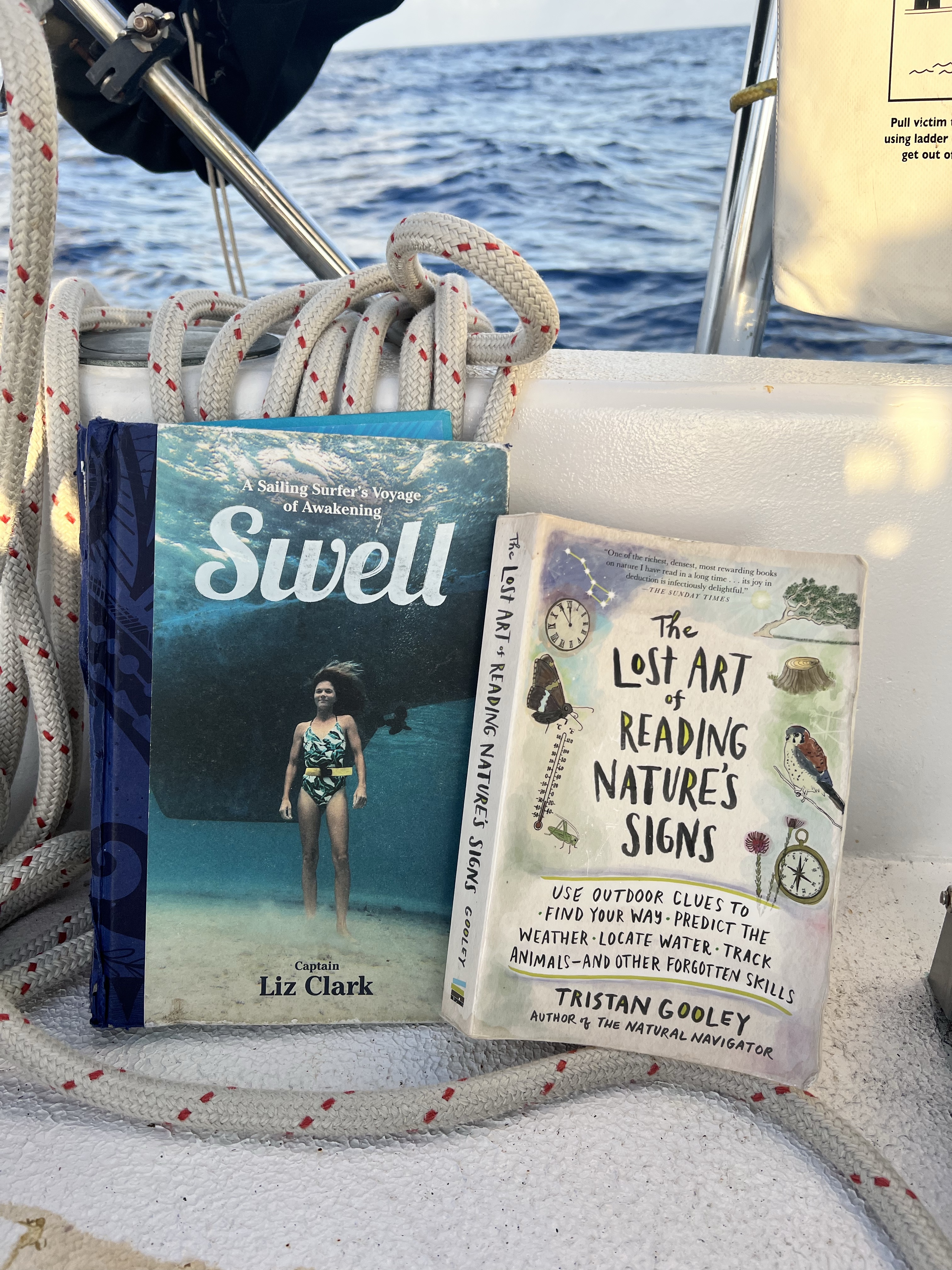 I clip my lifeline to my vest and get comfy. I finish reading Swell and start another interesting book titled, “The Lost Art of Reading Nature’s Signs,” by Tristan Gooley. Although every once in a while, a large swell will push us over further than I enjoy, overall, I become comfortable with the heavier rolling. I catch myself staring at the waves and predicting the degrees it’ll roll us. 20… 30… 40… 20… 15… 30Hey, I’m getting kind of good at this.