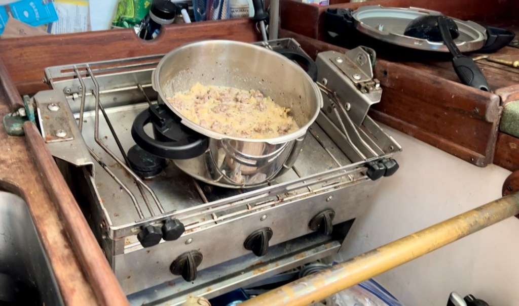 The next day, (after I caught up on sleep), I warm up Hamburger Helper for lunch. Cooking underway can be a huge pain. Our little propane stove top swings on a gimbal as we roll with the waves. Sometimes it rocks back and forth with a predictable rhythm I can handle. Other times, it’s more dramatic. Everything is sliding around on every surface it can. Cutting vegetables feels like the knife roulette game you play as dumb kids. And if you’re not holding onto your bowl or plate, it will inevitably fall onto the wood floor. Sometimes it’s the little things that keep us sane, to meal prep was essential for me for this trip. Brendan and I sit in the cockpit together to eat. Hamburger Helper was a quick meal my mother would whip us up as children, so I sit back and enjoy the fond memories paired with my comfort food.