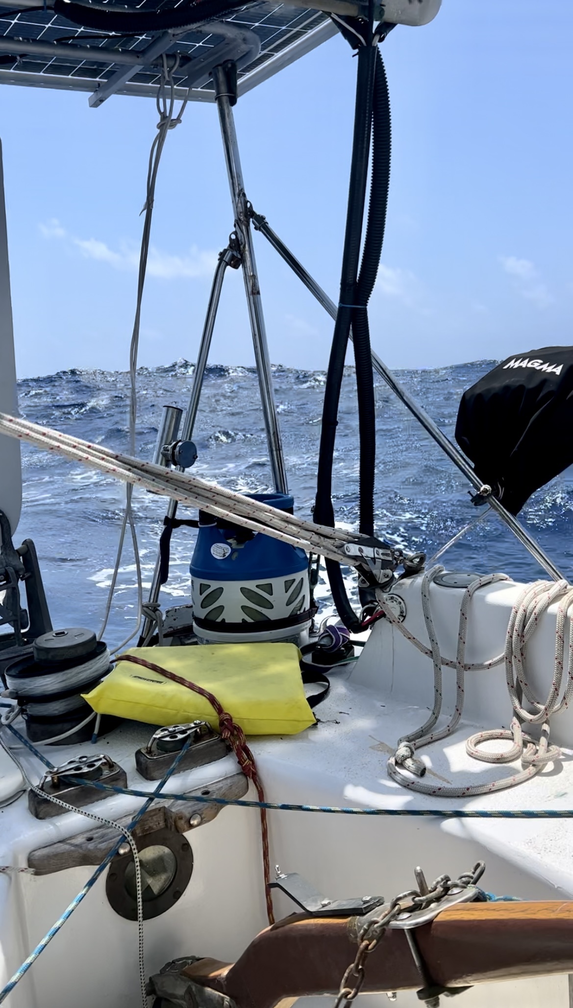 Waking to the clapping sounds of waves slapping the hull and leaning much more than usual, I already knew what he meant. I throw on my PDF and climb into the cockpit. “Holy shit!” I gawk, staring at the bright blue water hurtling toward us, one after the other. The wave periods weren’t as short as our Gulf Stream crossing, but they weren’t too long either.